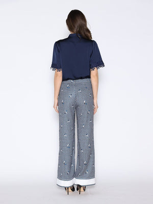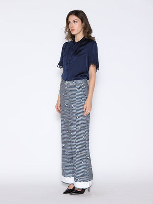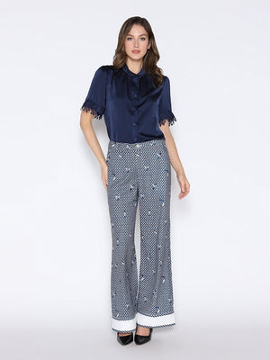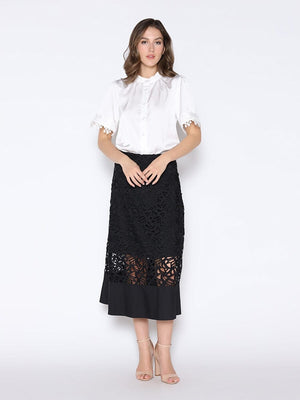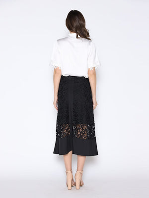 Lace Hem Short Sleeve Satin Round Neck Shirt