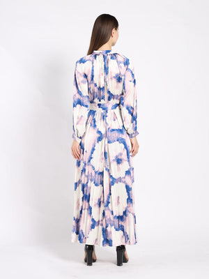 Long Sleeve Tie Belted Graphic Print Pleated Dress