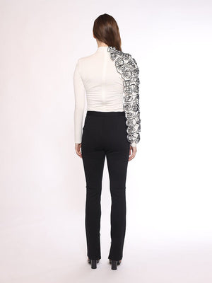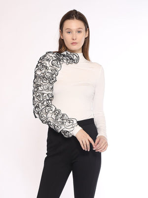 • This solid colored and fitted long sleeve top beautifully illuminates a floral ruffle shoulder. Highlighting a stylish look, this top is simple yet complex, holding together elements of traditional silhouettes while bringing in a rose covered sleeve.