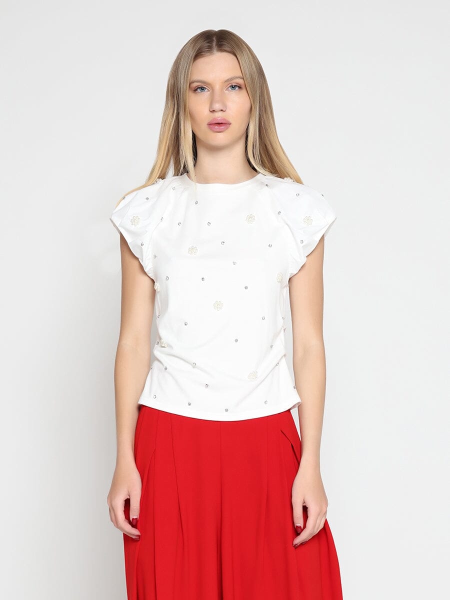 Short Puff Sleeve Rhinestone & Pearl Embellish