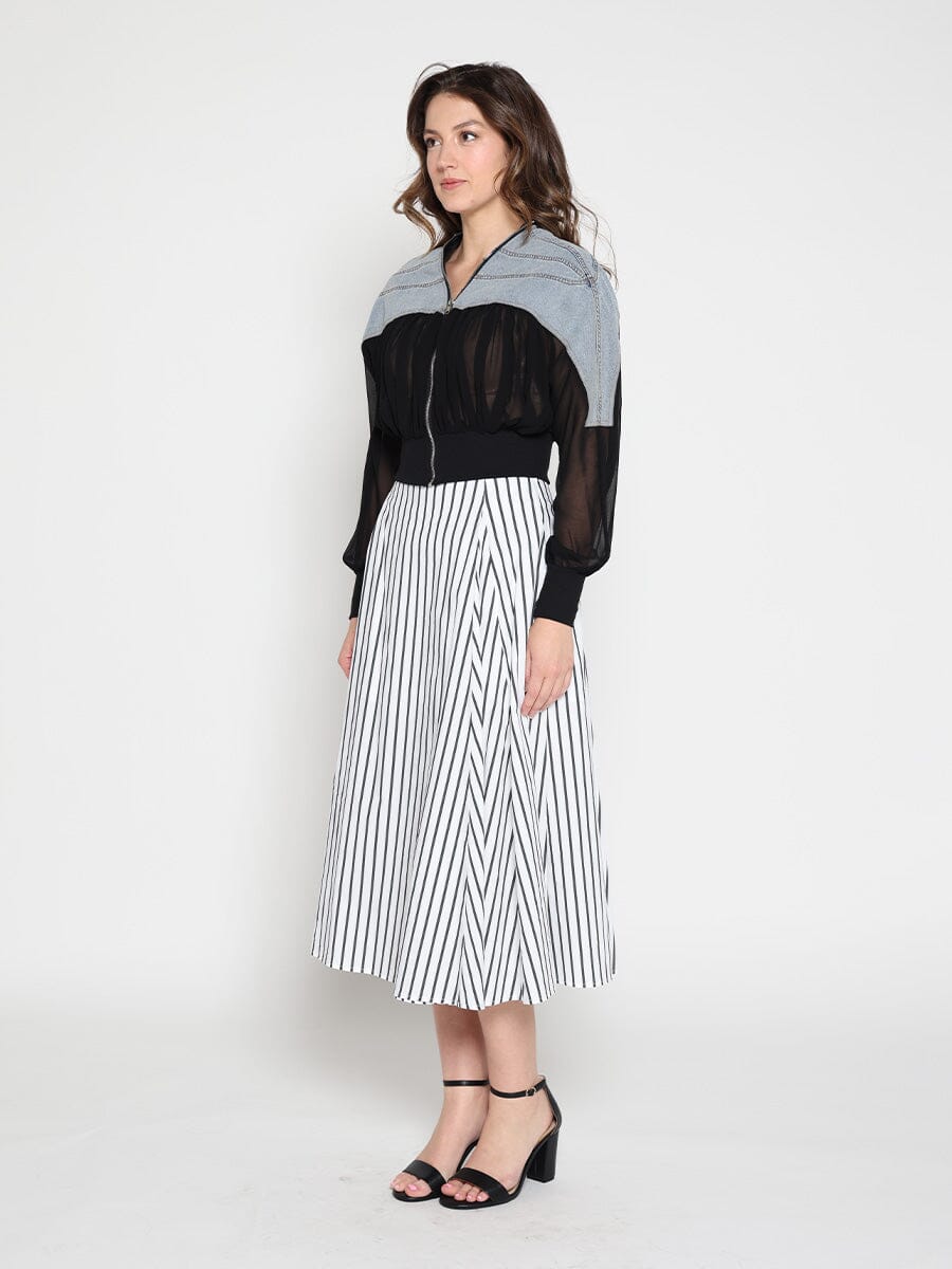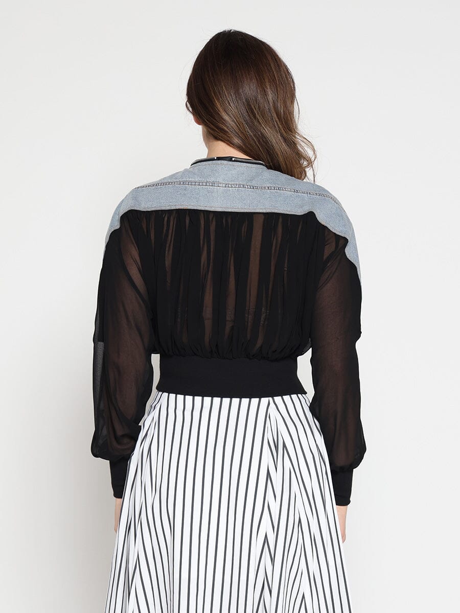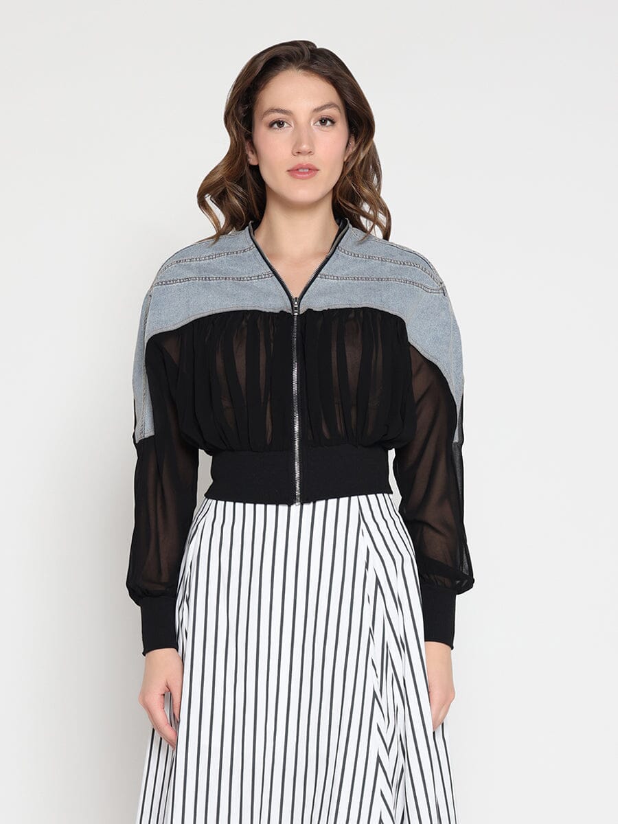 Zip-Front Crew Neck Spliced Denim Cropped Jacket